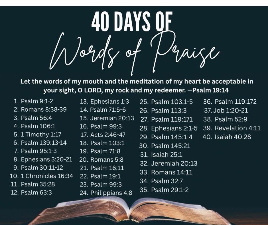 Today begins 40 Days of Words of Praise. My prayer each day is Psalm 19:14 — Let the words of my mouth and the meditation of my heart be acceptable in your side, O LORD, my rock and my redeemer 🙏🏼