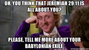 The prophesy of Jeremiah 29:11, was given corporately (not individually) to the Israelite nation of Judah facing God’s fatherly discipline in the form of 70 years of Babylonian exile. It is often misused to say “I know my new job is gonna be great because, Jer 29:11!” or, “can’t wait for college, Jeremiah 29:11.” It’s a stretch.