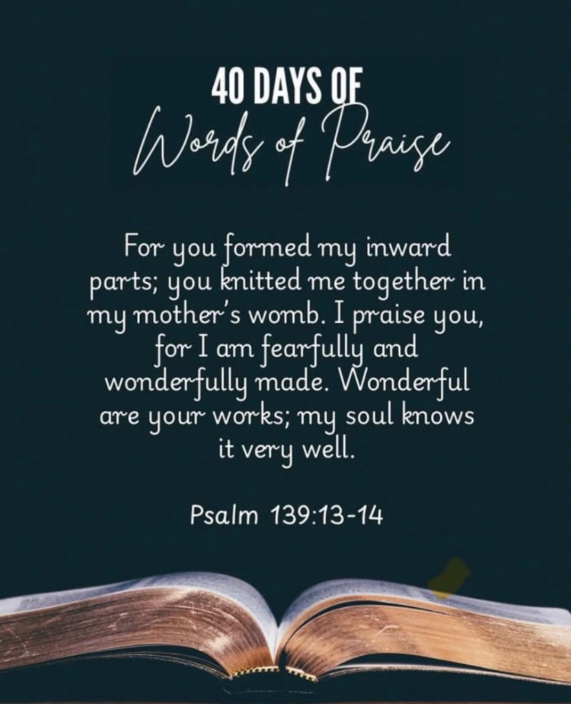 Psalm 139:13-14[13] For you formed my inward parts; you knitted me together in my mother’s womb. [14] I praise you, for I am fearfully and wonderfully made. Wonderful are your works; my soul knows it very well.