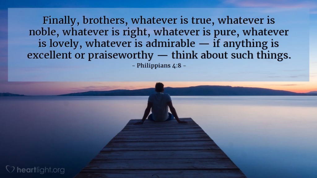 [8] Finally, brothers, whatever is true, whatever is honorable, whatever is just, whatever is pure, whatever is lovely, whatever is commendable, if there is any excellence, if there is anything worthy of praise, think about these things.